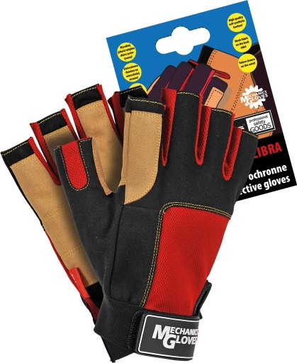 Rękawice ochronne wykonane z jasnej skóry syntetycznej połączonej z tkaniną, bez końcówek na palcach.