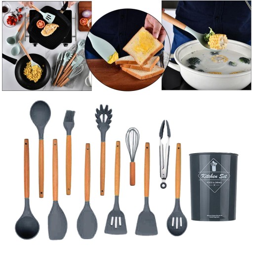 Food Grade 11 SZTUK Naczynia Żaroodporne Drewniany Uchwyt Turner Łyżka Gadżety Ciemnoszary
