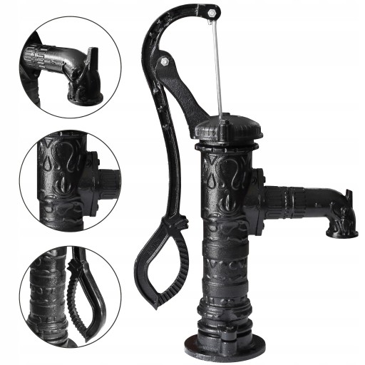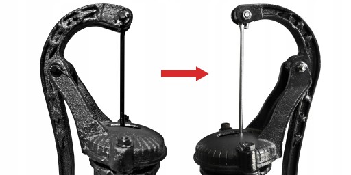 - Pompując wodę za sprawą rączki i przymocowanej do niej dźwigni wprawiamy tłok w ruch, który zasysa wodę ze studni. Specjalny zawór bagnetowy, blokuje powrót wypompowanej wody z powrotem do studni.