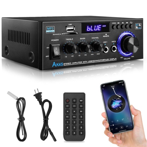 🎶 Wersja uaktualniająca cyfrowy wzmacniacz audio AK-45. W pełni zaktualizowana konstrukcja, moc znamionowa 40 W + 40 W, idealna do głośników pasywnych 4-8 cali. Rozszerzenie funkcji, dodaj gniazdo mikrofonu. Poza tym jakość dźwięku w przypadku odbiornika ze wzmacniaczem cyfrowym jest doskonalsza niż w przypadku zwykłych wzmacniaczy analogowych. Z wbudowaną kartą transmisji mocy, która obsługuje wejście zasilania AC 110-240 V i wejście prądu DC 12 V/5 A, gotowe do użycia.