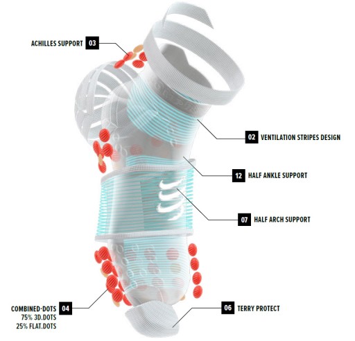 Elastyczny, kompresyjny materiał wokół łuku stopy, zapewnia wsparcie, przyspiesza powrót żylny i zapobiega przed skręcaniem się materiału.