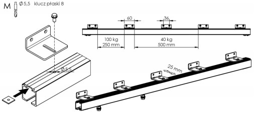 - szyna k-100, długość 2000 mm z możliwością skrócenia na dowolny wymiar - 1 szt