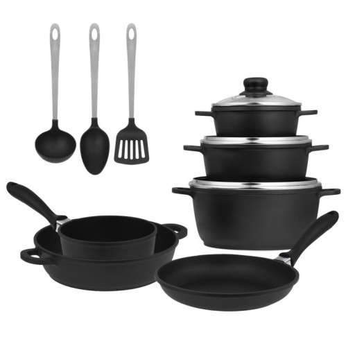 Zestaw garnków i patelni AMBITION SYMPHONY wykonano z wysokiej jakości odlewanego aluminium. Wysokogatunkowe materiały sprawiają, że naczynia te wyróżniają się m.in. odpornym na odkształcenia dnem. W dodatku dzięki doskonałemu przewodzeniu ciepła, szybko i równomiernie się ono nagrzewa. Dzięki temu gotowanie i smażenie jest nie szybsze, ale i przyjemniejsze. Garnki są przeznaczone na kuchenki indukcyjne, ale należy pamiętać, aby zwiększać źródło energii stopniowo i nie rozpoczynać procesu grzania od najwyższej mocy (funkcja Booster), gdyż naraża to powłokę naczynia na uszkodzenie.