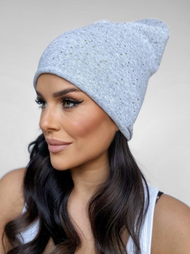 ✅ Czapka typu beanie/krasnal, delikatnie opadająca, wywijana, ozdobiona złotymi kropkami.