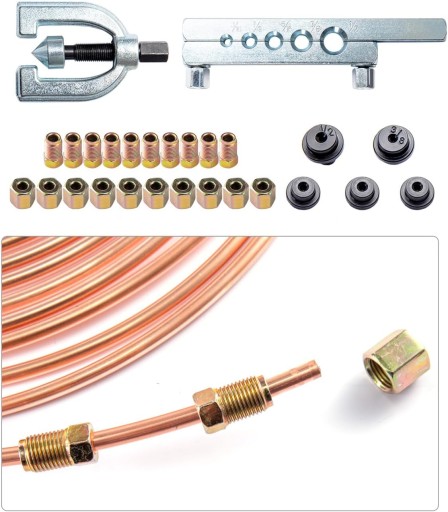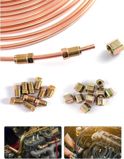 [ Material] The brake tube kit is made of high-quality brass, will not rust, is durable and high quality. It is very simple to use. Ideal for repairing and replacing existing brake pipes on various modern vehicles. [Unique Design] The brake cable has better strength and toughness to ensure your safe use. It requires additional brake pipe fittings, brake pipe flare kits, or a complete kit. [Pro Repair Kit] Brake Repair Kit is perfect for repairing your car's brake lines. Even small parts can be replaced with female connectors, allowing you to add parts to the original braking system. [Complete accessories] Brake line pipe repair kit includes brake pipe 20* nut flaring tool, including all the tools you need, you can use it with confidence. [Size] The length of the copper pipe is 25 feet, the outer diameter of the copper-plated pipe is 3/16 inches, the thickness of the copper pipe is about 0.7mm, and the length of the brake pipe is about 7.62 meters. It can be used for hydraulic pipes, fuel pipes or brake pipes. Road and so on. Product Description