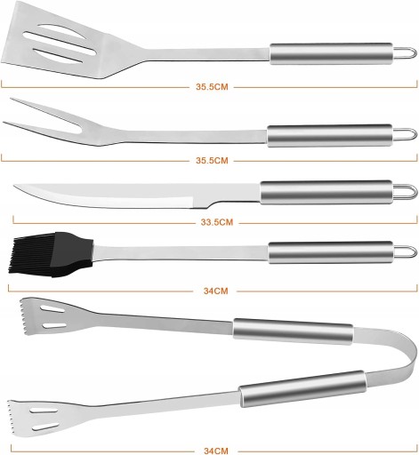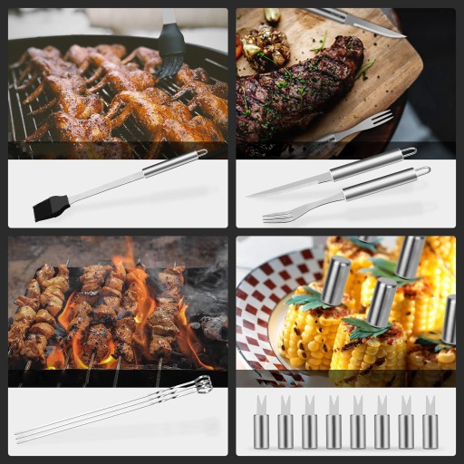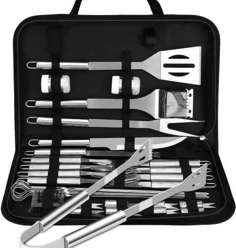 W zestawie: 1x szczypce, 1x łopatka, 2x pojemnik na pieprz/sól/przyprawy, 1x skrobak do rusztu, 1x zapasowa druciana szczotka do skrobaka, 1x duży nóż, 1x silikonowy pędzelek, 1x widelec do mięsa, 4x widelec, 4x nóż, 8x szpikulec do szaszłyków, 8x uchwyt do kukurydzy/warzyw