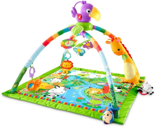 Kolorowa mata gimnastyczna z pianinkiem od Fisher Price dostosowuje się do etapu życia dziecka i pozwala na zabawę: na pleckach, brzuszku oraz na siedząco. Maluszek z zaciekawieniem patrzy na kolorowe zabawki na pałąku oraz migoczące światełka. Ruchome zabawki na łuku ponad głową zachęcają dziecko do uderzania i chwytania ich. Muzyka nagradza zabawę dziecka, inspirując go jednocześnie do dalszej aktywności. Kolorowe zabawki oraz duże lusterko zawieszone na łuku ponad główką malucha zachęci go do chwytania oraz potrącania, co doskonale rozwija zdolności motoryczne.