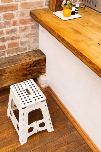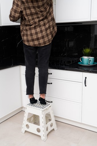 - Uniwersalne Zastosowanie: To nie tylko taboret – jest doskonałym partnerem przy sięganiu wyższych miejsc, korzystaniu z półek, sprzątaniu czy innych codziennych czynnościach. Jego wielofunkcyjność sprawia, że jest przydatny w każdym pomieszczeniu.