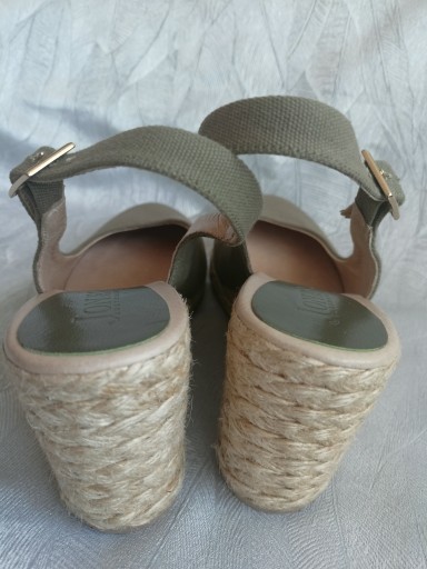 Hiszpańskie, letnie buty z zakrytymi palcami, osadzone na espadrylowym koturnie, który jest zrównoważony przez 8,5-centymetrową platformę. Płótno w kolorze khaki , wnętrz z jasnej skóry licowej. Będą wyglądać równie szykownie w połączeniu z dżinsami jak i lernią sukienką w stylu marino. Koturn opleciony beżowym sznurkiem. Wnetrze skórzane. Zapinane z boku na pasek i sprząćzkę