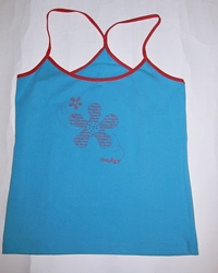 Podkoszulka jest niebieska, typu boxerka z motywem kwiatka na przodzie, krój dopasowany.