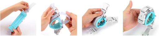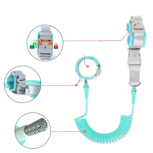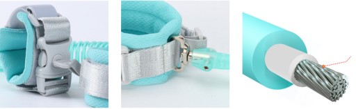 - Korzystanie z tej konstrukcji zabezpieczającej przed zgubieniem nadgarstka z zamkiem i jej główną konstrukcją w uchwycie rodzica, aby zapobiec przypadkowemu otwarciu.