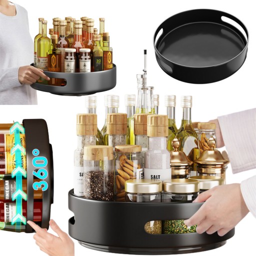 Obrotowa taca na przyprawy jest domowa i wielofunkcyjna, odpowiednia do łączenia różnych przypraw w celu konserwacji. Wykonana z najwyższej jakości materiałów, obrotowa taca jest solidna i trwała, a jej prosty i modny design jest idealnym organizerem do przechowywania w lodówce, kuchni, spiżarni lub łazience.