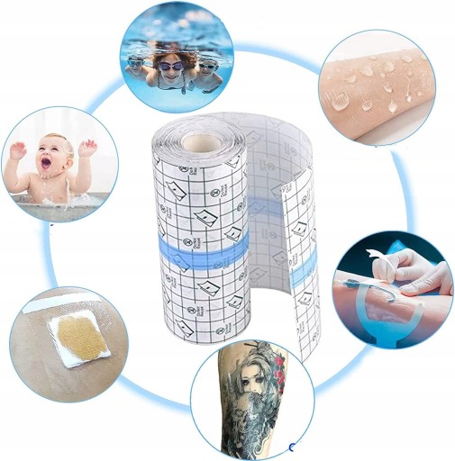 Wodoodporna taśma opatrunkowa składa się z 3 warstw, oderwij pierwszą warstwę, przyklej drugą warstwę na powierzchni skóry, a następnie zdejmij górną warstwę. Jest szczególnie odpowiedni do przyklejania się do skóry przez długi czas. Papier podkładowy bandaża ma linie siatki ułatwiające cięcie bez pozostawiania śladów. Wygląd okrągłej rolki, łatwy w użyciu.
