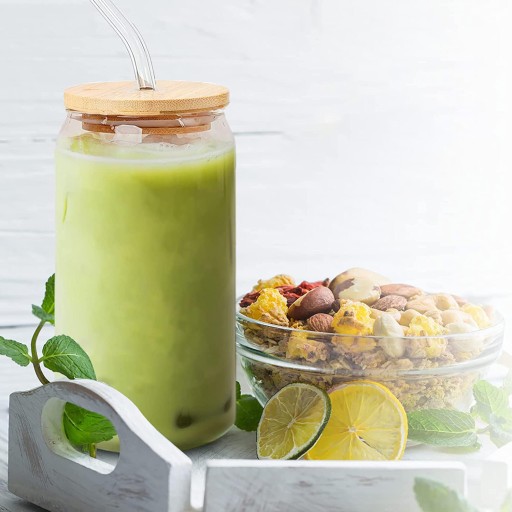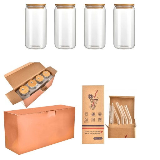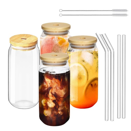 СТЕКЛЯННАЯ КРУЖКА 500 МЛ С БАМБУКОВОЙ КРЫШКОЙ И СОЛОМОЧКОЙ, 4 ШТ.