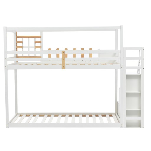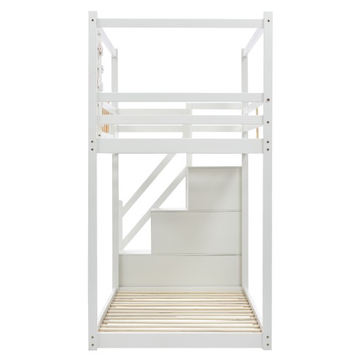 Łóżko piętrowe ze schodami, okienkiem i skrzynią na półki, rama z litego drewna sosnowego, łóżko dziecięce z 3 szafkami w schodach, z kratką zabezpieczającą przed upadkiem, białe, 90x200cm