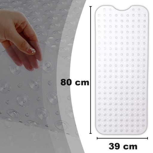 Mata antypoślizgowa do wanny ma wymiary 77,5 x 39 cm, co sprawia, że pasuje do większości standardowych wanien. Mata pokrywa dno wanny, zapewniając komfort i stabilność podczas kąpieli.