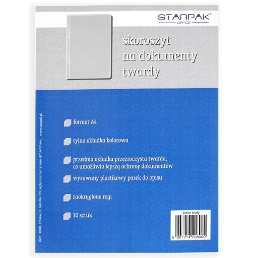 Skoroszyt formatu A4, służący do przechowywania i prezentacji dokumentów. Wykonany z mocnego PCV. Przednia okładka przezroczysta, twarda, tylna - biała. Zaokrąglone rogi. Listwa na opis. Możliwość wpinania do segregatorów wszystkich typów.