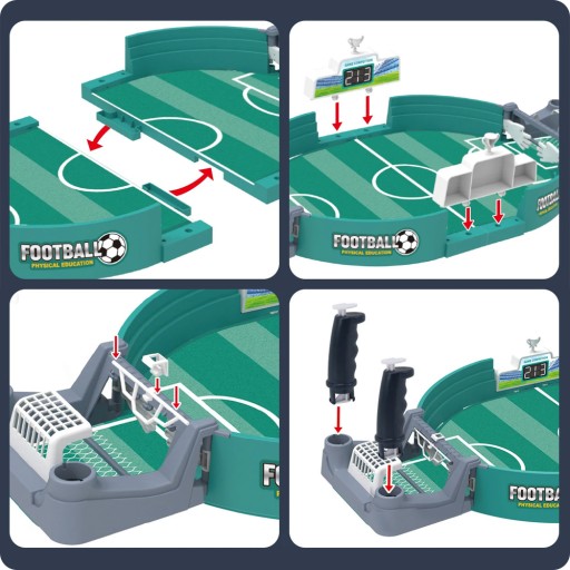 - Zawartość zestawu: boisko do gry (dwie połowy), piłeczki, suwaki do liczenia punktów, rączki ze spustami