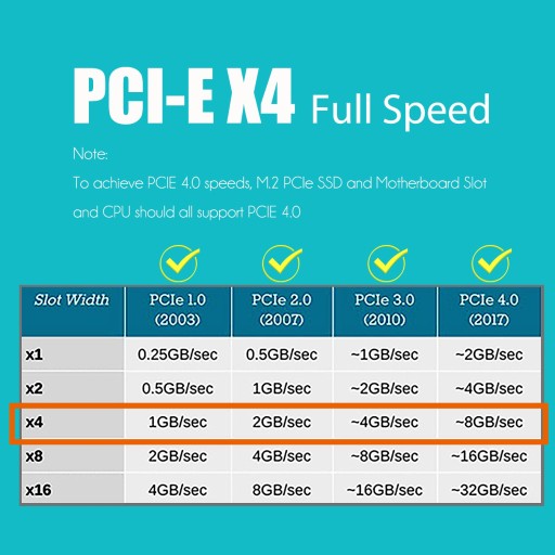 - Aby osiągnąć pełną prędkość PCIe 4.0 X4, Twoja płyta główna i procesor oraz dysk SSD M.2 PCIe powinny obsługiwać PCIe 4.0, w przeciwnym razie pełna prędkość PCIe 4.0 X4 nie będzie możliwa