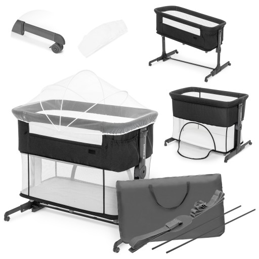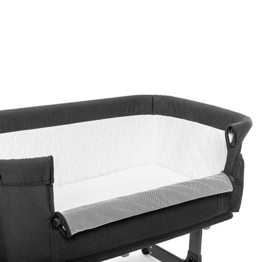 Łóżeczko jest wyposażone w moskitierę, regulowany kąt materaca, przezroczysty bok z siatki dla lepszej wentylacji, boczne wyjście dla łatwiejszego dostępu oraz pasy mocujące do łóżka rodziców.