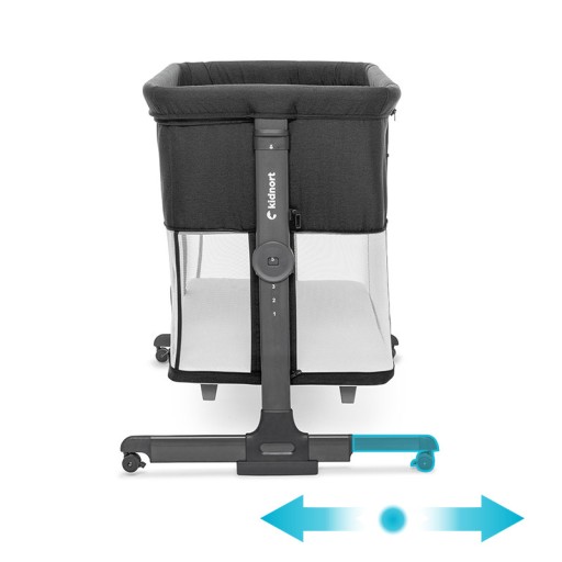 Pneumatyczne nóżki umożliwiają bliskie dosunięcie łóżeczka do łóżka rodziców i dostosowanie ich długości, zapewniając bezpieczne połączenie. 4 kółka z blokadą ułatwiają przemieszczanie łóżeczka i jego stabilne zablokowanie w wybranym miejscu. Dzięki temu, łóżeczko można łatwo przestawiać między pomieszczeniami, zachowując pełną funkcjonalność.