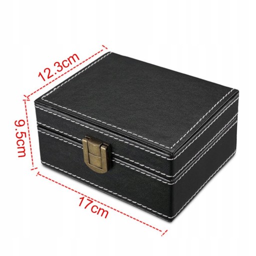 Specyfikacja: Rozmiar zewnętrzny 17cm x 12 cm x 9,5 cm Kolor wiodący: Czarny Wykonania: skóra ekologiczna z przeszyciami Pudełko jest duże i umożliwia schowanie nawet telefonu do środka