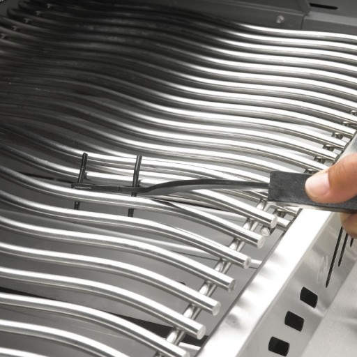 Możesz również użyć tego poręcznego narzędzia do przesuwania płyt do obsmażania na grillu. Uchwyt do podnoszenia rusztu ma wytrzymałą metalową konstrukcję obejmującą rękojeść połączoną nitami ze stali nierdzewnej.