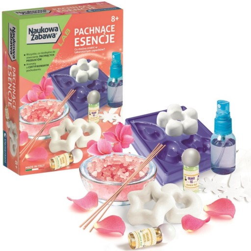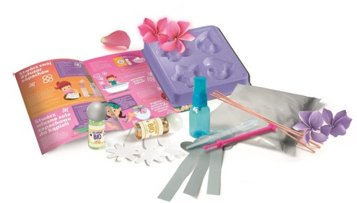 Zestaw zawiera wszystko, co niezbędne do doświadczeń z kosmetyką i do własnoręcznego komponowania perfum i tworzenia pachnących ozdób.