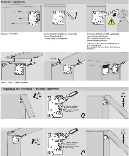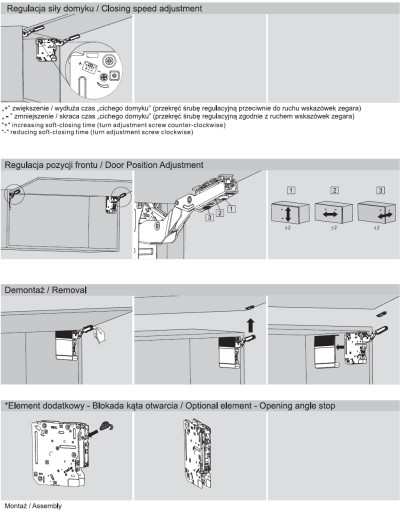 Dzięki śrubom regulacyjnym dostępnym od przodu korpusu można regulować w trzech kierunkach położenie frontu i siłę podtrzymującą. Nie wymagają przy tym stosowania dodatkowych zawiasów. Standardowy kąt otwarcia wynosi 107 stopni lub 110 w wersji Strong, co daje wygodny dostęp do całej zawartości szafki, ale można go łatwo ograniczyć do 90 stopni. Top-Stays dostępny jest także w sześciu wariantach kolorystycznych, co jest dodatkowym atutem przy całościowym komponowaniu mebli.