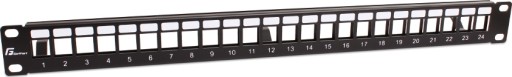 24 portowy uniwersalny panel krosowy zaprojektowany do instalacji w szafach rack 19". Posiada 24 wolne sloty, w których mogą zostać zainstalowane moduły typu keystone w różnych konfiguracjach.