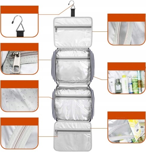- Kosmetyczka wisząca, miękkie wyściełane paski, bezpieczny podwójny zamek.