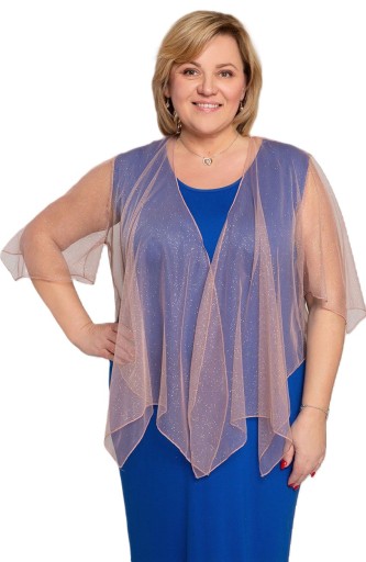 Ta lekko błyszcząca, tiulowa narzutka z brokatem sprawdzi się przy wielu codziennych i odświętnych okazjach jako kobiece uzupełnienie stylizacji. Narzutkę polecamy w szczególności Paniom pomiędzy rozmiarami 46, a 56.