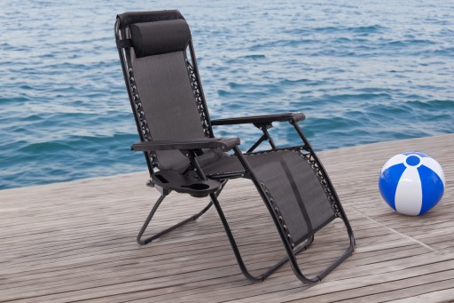 Składany, komfortowy leżak z podnóżkiem, zagłówkiem i stolikiem na napoje w kolorze czarnym.