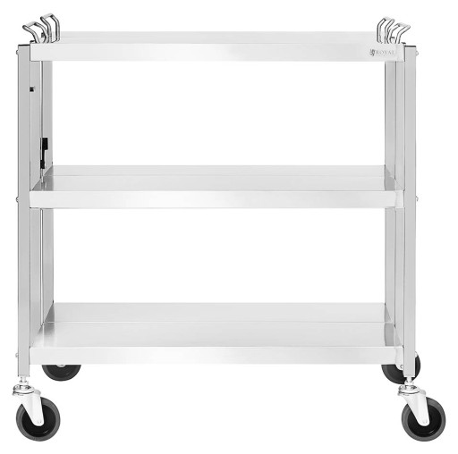 Wózek kelnerski marki Royal Catering wykonany został z wysokiej jakości stali nierdzewnej. Jego nośność wynosi 90 kg. Na 4 płynnie kręcących się kółkach, w tym 2 z hamulcami szybko i cicho przewieziesz jedzenie, napoje lub naczynia w wybrane miejsce na stołówce, w kuchni lub restauracji. Łatwo dostępne 3 półki o wymiarach 500 x 830 cm oferują dużo miejsca do przechowywania akcesoriów. Składana konstrukcja pozwala na łatwy transport i przechowywanie. Skrętne kółka zrobiono z gumy termoplastycznej (TPR). Produkt jest odporny na czynniki zewnętrzne, a gładka powierzchnia jest łatwa w czyszczeniu.
