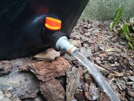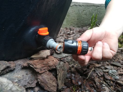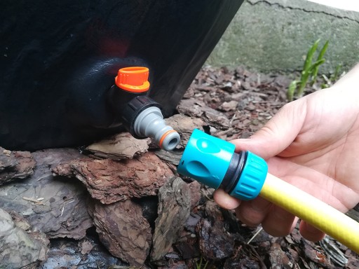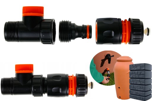 ➡️ Łącznik z zaworem, na którym zamontowana jest wkrętka ( przyłącze) z szybkozłączką umożliwia podłączenie węża ogrodowego o średnicy 1/2" z pojemnikiem na wodę deszczową, a także przyłączenie węża do kranu o średnicy 3/4".