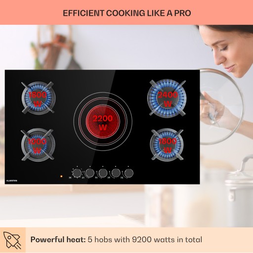Płyta gazowa MultiChef 5 marki Klarstein jest idealnym połączeniem 4 palników gazowych i jednego pola grzejnego szklano-ceramicznego w prawdziwy multitalent. Dzięki mocy całkowitej rzędu 9,2 kW, 4 różnym rozmiarom palników oraz 4 żeliwnym krzyżakom jest ona doskonale wyposażona do przygotowania każdego posiłku, jaki można sobie wyobrazić. Wielkość płomienia można w każdej chwili łatwo regulować za pomocą płynnie działających pokręteł. Powierzchnia wykonana z hartowanego szkła ceramicznego nie tylko elegancko wygląda, ale jest również niezwykle łatwa do czyszczenia. Elektryczny układ zapłonowy z zabezpieczeniem przed zanikiem płomienia zapewnia bezpieczną obsługę.