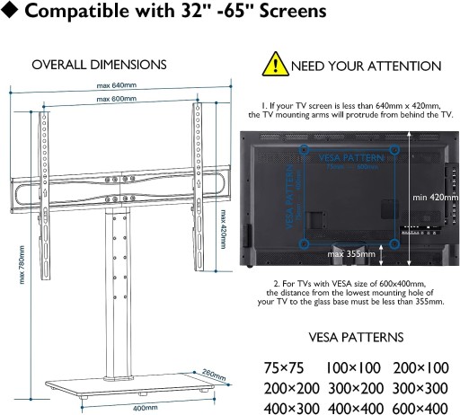 - Kompatybilność - uniwersalny stojak pasuje do większości tv 32 37 40 42 47 50 55 60 65 cali; wzory vesa: 75x75/100x100/200x200/300x200/300x300/400x300/400x400/600x400mm, jest kompatybilny z markami tv takimi jak Samsung LG Sony Sharp Panasonic jvc Hitachi Hisense Toshiba LCD LED OLED Telewizory plazmowe.
