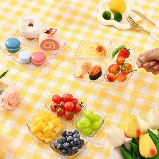 Talerzyk posiada 4 wgłębienia, dzięki czemu sprawdza się do serwowania przekąsek, przystawek, sosów, dipów, owoców.