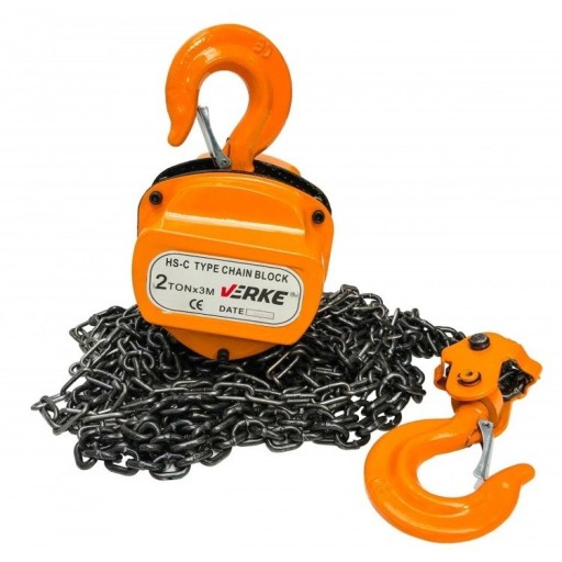 Wyciągarka łańcuchowa marki Verke posiada napęd ręczny i przekładnię, która pozwala na podniesienie ciężaru do 2000 kg. Łańcuch wykonany z wysokiej jakości stali. Ogniwa łączone metodą zgrzewania oporowo-iskrowego, co gwarantuje odpowiednią jakość i wytrzymałość ogniwa. Wyciągarka wyposażona jest w bezpieczne haki posiadające blokadę uniemożliwiającą wypięcie się ładunku.