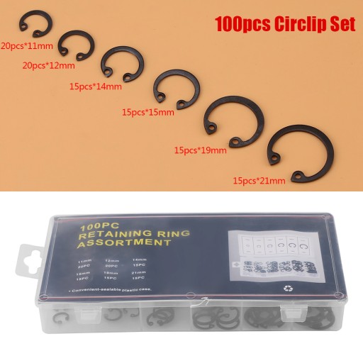 100 szt. Zestaw asortymentowy pierścieni osadczych zatrzaskowych 11 mm - 21 mm, 6 rozmiarów z pudełkiem