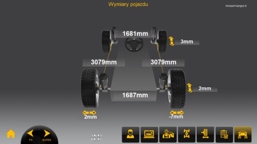 Pomiar długości i przekątnych auta – oprogramowanie pozwala na kontrole przesunięcia osi względem siebie.