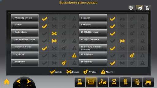 Protokół kontrolny stanu opon, zawieszania i pojazdu – przed rozpoczęciem pomiaru operator ma możliwość przygotowania protokołu kontrolnego z informacją o stanie technicznym auta.