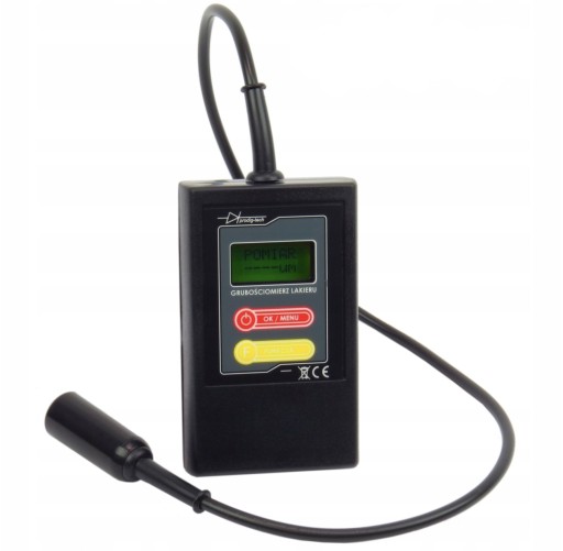Zastosowanie: Pomiar grubości lakieru - blacha stalowa, blacha stalowa ocynkowana ; Sonda: na przewodzie - 60 cm ; Rozdzielczość pomiaru: 1 / 10 µm ; Zakres pomiarowy: 0 . 1100 µm ; Pamięć: 100 pomiarów ;