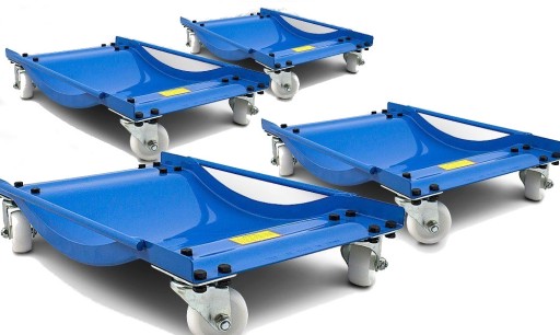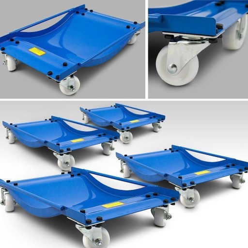CZTERY PRAKTYCZNE WÓZKI MANEWROWEDzięki oferowanym przez nas wózkom manewrowym w szybki i łatwy sposób przemieścisz swój samochód w dowolne miejsce. Masywna konstrukcja sprawia, że wózki są stabilne i bardzo wytrzymałe. Udźwig jednego wózka to 450 kg. Idealnie sprawdzą się w salonach samochodowych, warsztatach. Przydatne przy holowaniu, naprawie oraz wystawach samochodowych. ZESTAW ZAWIERA: ✓ 4 x wózek manewrowy,✓ 16 x obrotowe kółka,✓ materiały montażowe DANE TECHNICZNE: Wymiary: (Wys / Szer / Gł) 60 x 39 x 13 cm,Ładowność: 450 kg na wózek,Szerokość opony: max. 35 cm,Waga: 8,10 kg (wózek), Materiał: blacha stalowa,Kolor: niebieski,Średnica kółka: 75 mm
