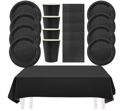 Набор тарелок, чашек, бумажных салфеток, черная скатерть BIRTHDAY