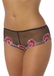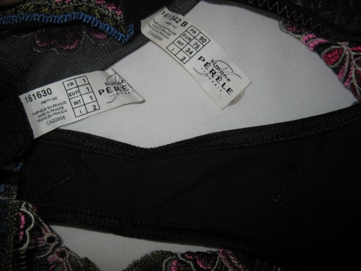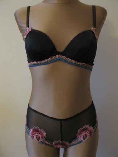 Z koronki i tkaniny w kolorze czarnym, ozdobiony kolorowym ściegiem oraz kwiatami w odcianiach różu . Stanik - na fiżbinach, lekko usztywniane miseczki, ramiączka regulowane, zapięcie z tyłu. Majtki - z czarnej koronki ozdobione kwiatami w odcieniach różu.