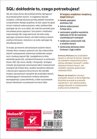 To drugie, gruntownie zaktualizowane wydanie nieocenionego zbioru receptur, podanych tak, aby maksymalnie ułatwić rozwiązywanie codziennych problemów związanych z budową zapytań SQL. Uwzględniono tu kilka wariantów języka SQL, zaimplementowanych w systemach Oracle, DB2, SQL Server, MySQL i PostgreSQL. W książce znalazły się propozycje zastosowania takich nowoczesnych rozwiązań jak funkcje okna, wspólne wyrażenia tablicowe i rekurencyjne zapytania hierarchiczne. Nie zabrakło receptur opracowanych specjalnie dla analityków danych, umożliwiających zastosowanie mediany odchylenia bezwzględnego i prawa Benforda, a także wyszukiwanie danych tekstowych na podstawie brzmienia słów.