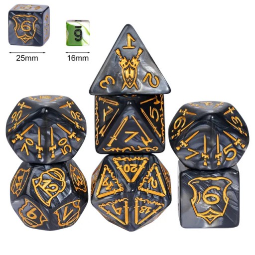 Komplet kości, czyli siedem wysokiej jakości kostek. Dzięki odpowiedniemu wyważeniu są bardzo wygodne w użyciu.