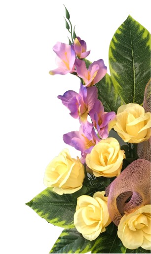 Kompozycja kwiatowa została wykonana z najwyższej jakości kwiatów sztucznych i dodatków. Do stworzenia dekoracji zostały wykorzystane ponadczasowe róże, mieczyki, duża ilość zielonych liści oraz elegancka taśma, wypełniająca puste przestrzenie.