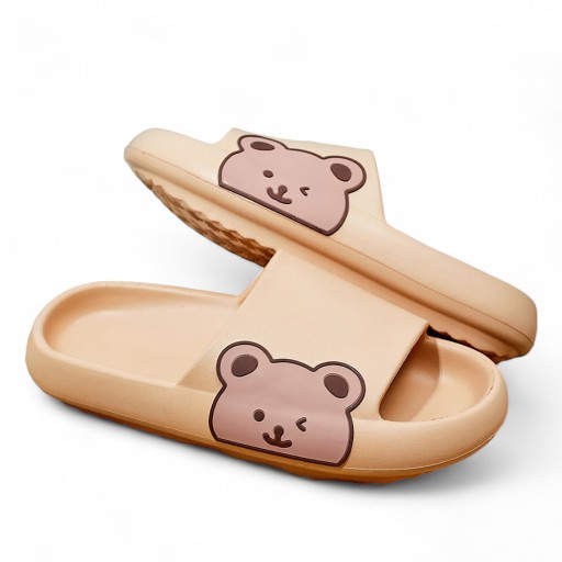 Świetne damskie gumowe klapki na płaskiej podeszwie, paseczek zdobiony uroczym misiem. Idealny wybór na wakacje!